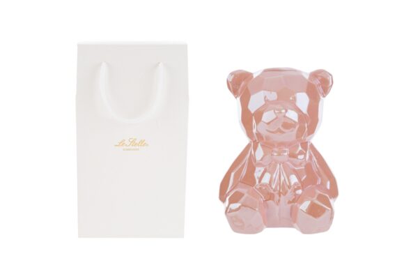 Un tenero salvadanaio in porcellana rosa, perfetto per celebrare momenti speciali. Con le sue dimensioni di 14x13xh.18 cm e un design curato a forma di orsetto, è ideale come bomboniera per nuove nascite o battesimi. Completo di shopper coordinata, aggiunge un tocco raffinato e significativo alle tue occasioni importanti.