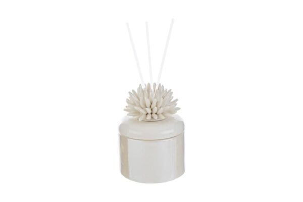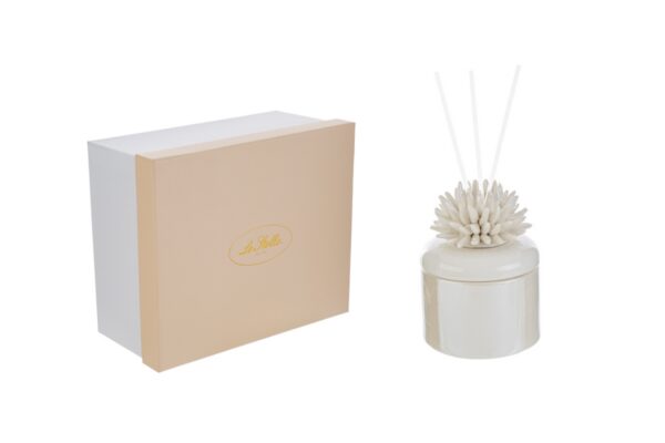 Profumatore elegante in porcellana bianca, impreziosito da un raffinato dettaglio a forma di corallo. Le dimensioni compatte (8,5×8,5xh.11,5 cm) lo rendono ideale per qualunque ambiente della casa o dell’ufficio. Completo di astuccio, è la bomboniera perfetta per celebrare ogni evento con stile e classe.