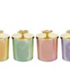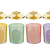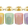 Scatola in vetro con candela proposta in quattro colori assortiti. Ogni pezzo presenta un elegante coperchio dorato dal design moderno e raffinato. La confezione comprende anche una shopper coordinata, ideale per facilitare la consegna e la presentazione. Si tratta di bomboniere adatte ad ogni evento, perfette per matrimoni, battesimi o altre ricorrenze speciali, offrendo un elemento decorativo di stile per ogni ambiente.