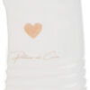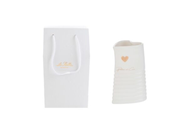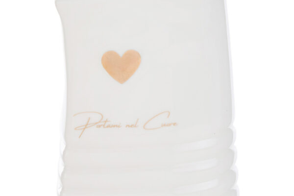 Vaso in porcellana bianca. La scritta in oro “Portami nel Cuore” dona un messaggio dolce e significativo, rendendolo un’idea regalo speciale per chi ami. Ideale come cadeau raffinato per i tuoi eventi.