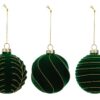 Il SET 3 PALLINE ASS.VETRO COL.VERDE diam.12CM propone bomboniere dal design elegante, realizzate in vetro verde con decorazioni dorate. Perfette per il periodo natalizio, queste sfere da 12 cm si distinguono per lavorazioni moderne e dettagli raffinati, ideali per valorizzare qualsiasi albero di Natale o composizione stagionale.