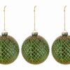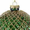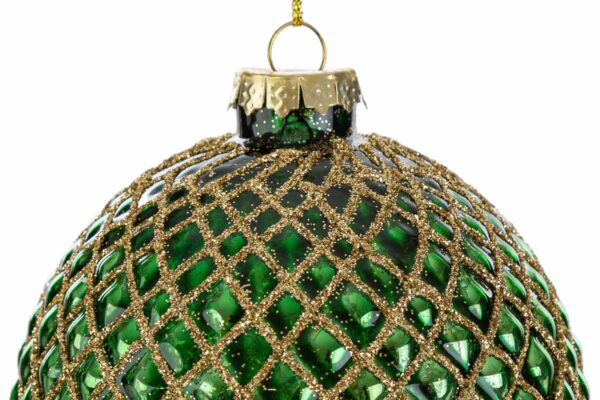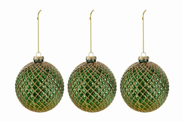 Il set comprende tre bomboniere natalizie in vetro verde, ciascuna dal diametro di 10 cm, ideali per decorare l’albero con uno stile moderno e raffinato. La superficie presenta un motivo intrecciato dorato che riflette la luce, valorizzando l’ambiente e offrendo un elegante tocco festivo durante il periodo natalizio.