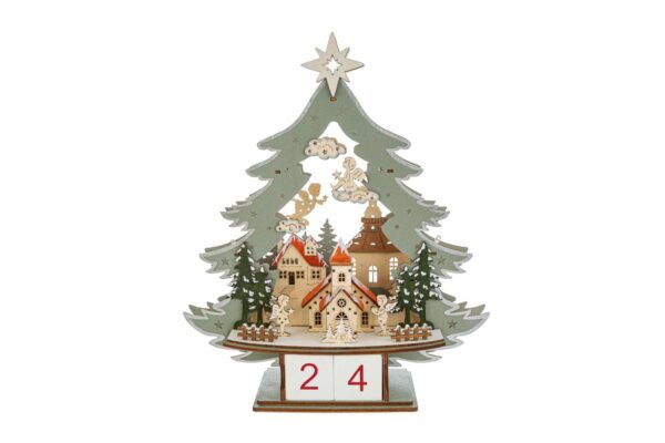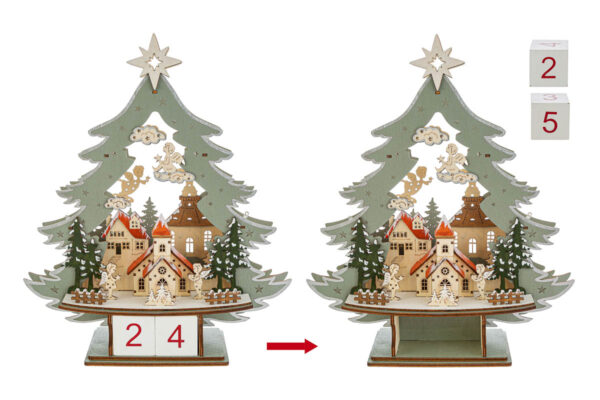 Albero datario in legno con LED, dimensioni 30,5x9x35,5 cm. Elegante bomboniera perfetta per il periodo natalizio, unisce design moderno e calda atmosfera luminosa.