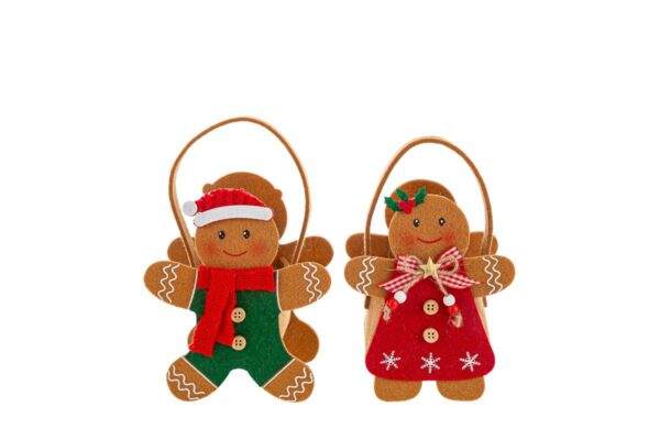 Bomboniere natalizie in stoffa, a forma di borsetta biscotto allo zenzero, disponibili in due varianti. Perfette per donare un tocco originale alle decorazioni festive.