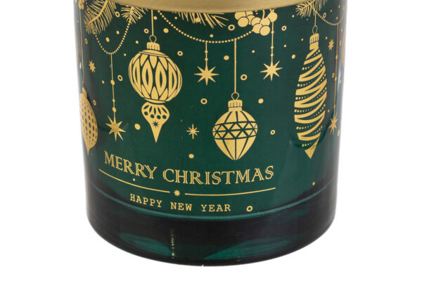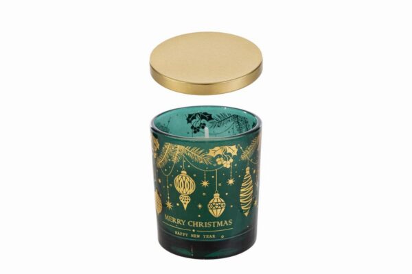Candela profumata in barattolo di vetro verde, realizzata in cera, ideale come bomboniera raffinata per il periodo natalizio, aggiungendo atmosfera e profumo agli ambienti.