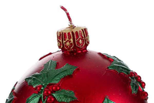 Candela sfera natalizia in cera rossa, diametro 9 cm, ideale come bomboniera per il periodo delle festività per un tocco elegante e tradizionale.