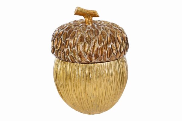 Scatola ghianda in resina dorata 14x14xh.19 cm, perfetta come bomboniera raffinata e moderna per il periodo natalizio, unendo stile decorativo e funzionalità.