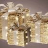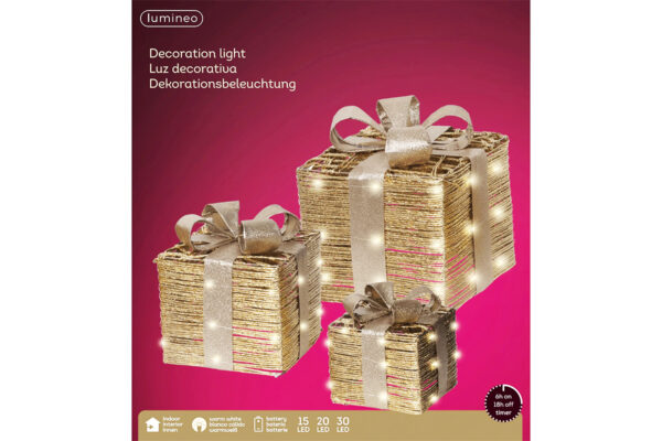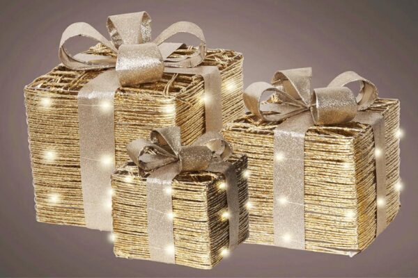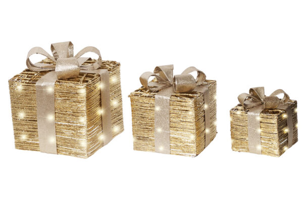 SET 3 PACCHI NATALIZI LED COL.ORO TIMER 6HR 17CM20L/23CM30L/30CM40L