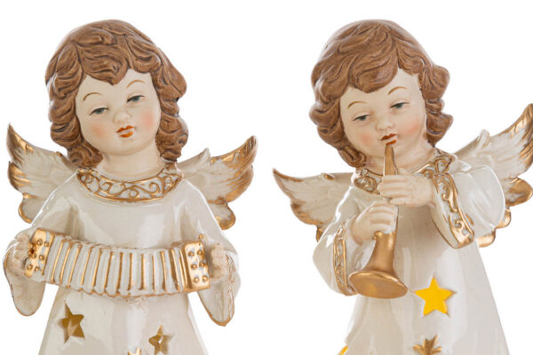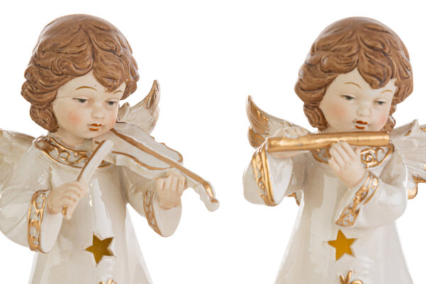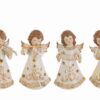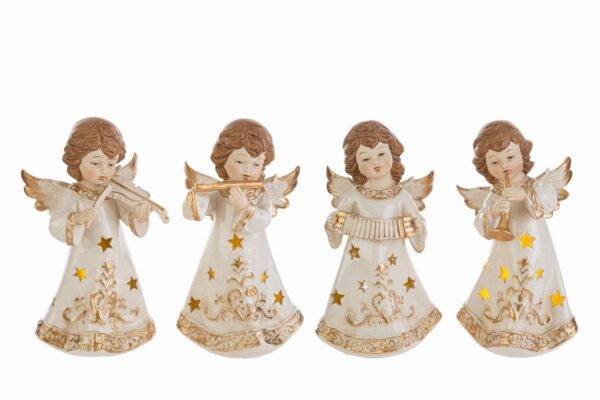 Gli angeli natalizi in porcellana con illuminazione LED, proposti in quattro varianti assortite, rappresentano bomboniere raffinate ideali per il periodo natalizio. Caratterizzati da dettagli dorati e motivi stellati, misurano 10x10x18 cm e aggiungono un tocco di eleganza luminosa a qualsiasi ambiente domestico o allestimento natalizio.
