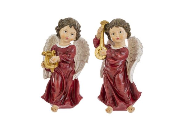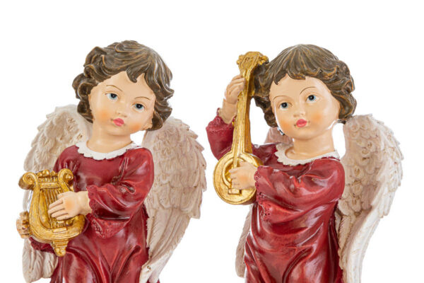 Set di due angeli natalizi realizzati in resina rossa, perfetti come bomboniere durante il periodo natalizio. Ogni statuina misura 11,5x10xh.20,5 cm, presenta dettagli curati e rifiniture dorate sugli strumenti musicali, donando un tocco elegante e tradizionale all’ambiente. Ideali per arricchire le decorazioni di casa.
