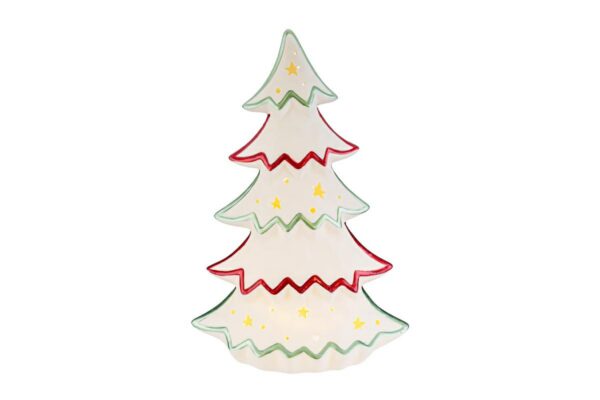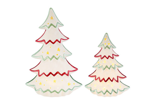 Albero natalizio in porcellana con LED, dimensioni 19x11xh.28,5 cm, ideale come bomboniera raffinata e luminosa per omaggiare il periodo natalizio.