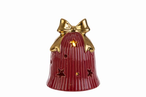 Campana fiocco in ceramica rossa con luce LED, ideale come bomboniera raffinata per il periodo natalizio. Dimensioni: 7,5×7,5×h.9,5 cm.