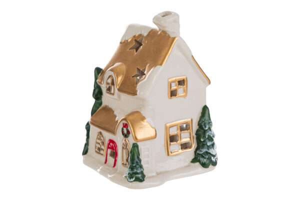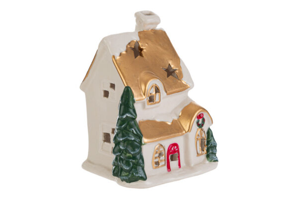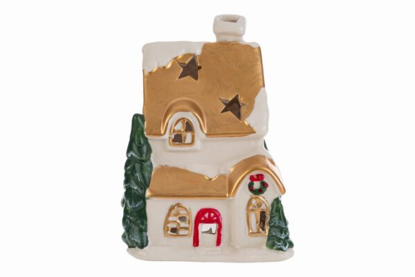 Casetta natalizia in porcellana con LED, misura 8,5x8xh.10 cm. Bomboniera ideale per il periodo natalizio, elegante punto luce decorativo per ambienti interni.