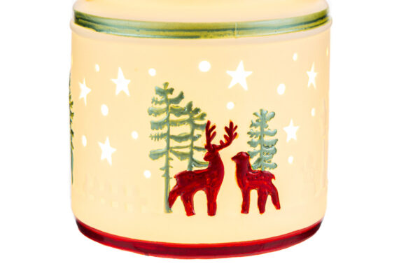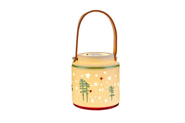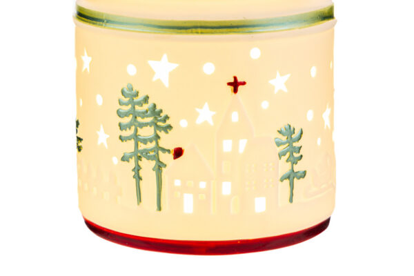 Lanterna natalizia in porcellana con LED, dimensioni 12x12xh.13 cm, ideale come elegante bomboniera per il periodo natalizio, dona un tocco luminoso raffinato.