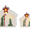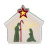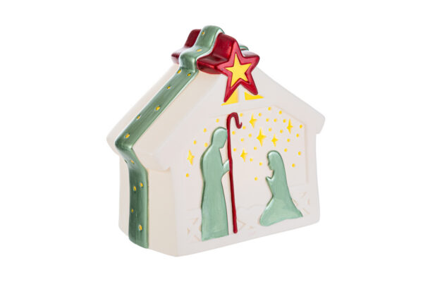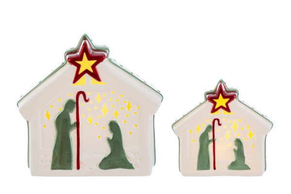 Presepe in porcellana con LED, dimensioni 17,5x10x16 cm, ideale come bomboniera natalizia elegante e luminosa grazie all’illuminazione interna integrata.