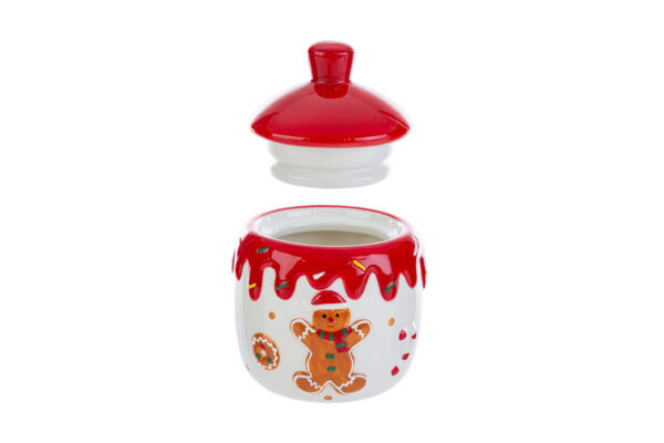 Bomboniere natalizie in ceramica a forma di biscotto zenzero, ideali per eventi aziendali o regali. Dimensioni compatte 10x10x11,5 cm, perfette per confezioni raffinate.