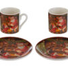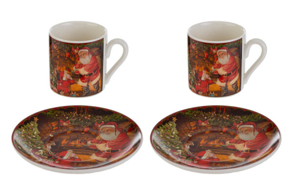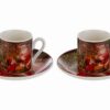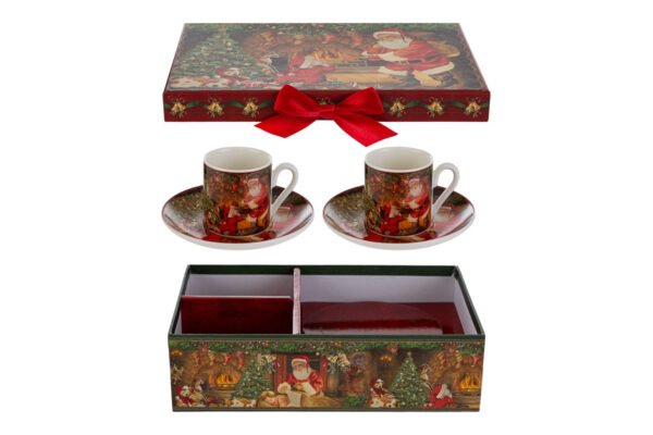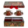Elegante set di due tazzine con piattini in porcellana, confezionato in astuccio, ideale come bomboniera raffinata per il periodo natalizio in contesti professionali.