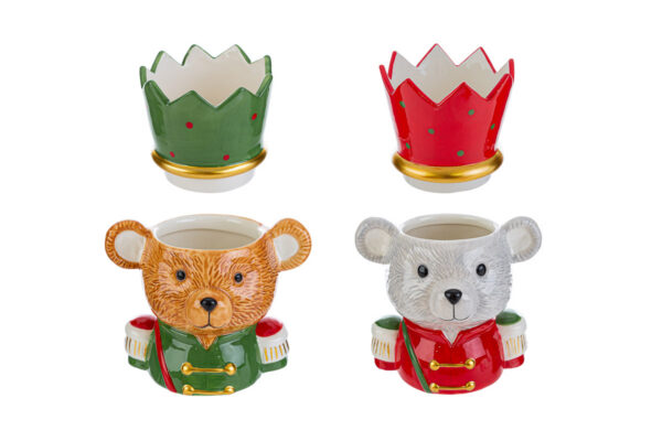 Vaso in ceramica a forma di orsetto, proposto in due varianti, ideale come bomboniera raffinata per eventi e occasioni festive durante il periodo natalizio.