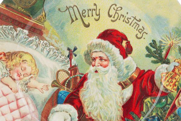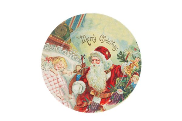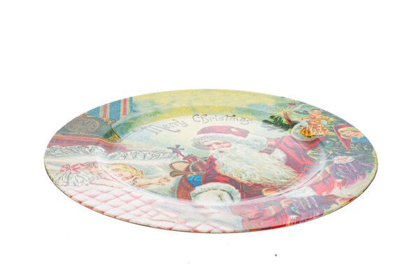 Vassoio in plastica decorato con Babbo Natale, ideale come bomboniera natalizia per eventi aziendali, perfetto per presentare dolci e piccoli omaggi durante le festività.