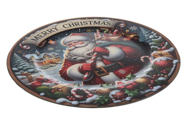 Vassoio natalizio in plastica con decorazione Babbo Natale, diametro 40 cm. Perfetto come bomboniera elegante e funzionale per eventi e regali nel periodo natalizio.