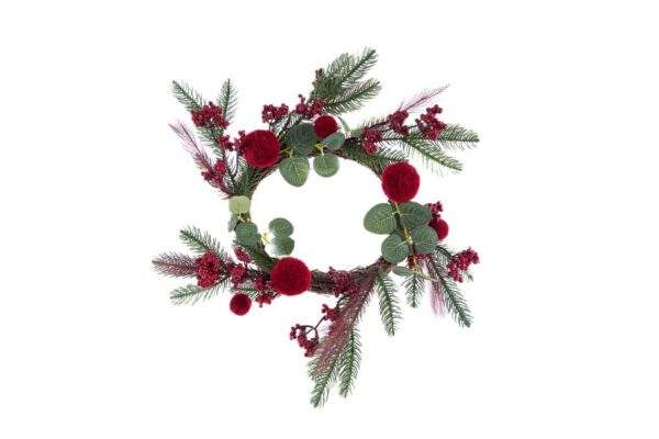 Ghirlanda natalizia in stoffa rossa dal design elegante, ideale come bomboniera per il periodo natalizio. Dimensioni: diametro interno 22 cm, esterno 42 cm.