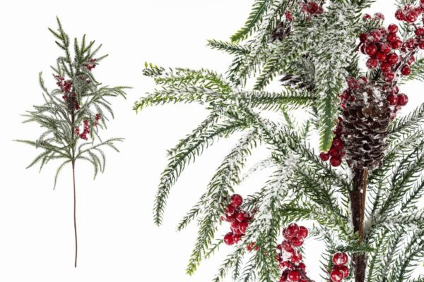 Tralcio decorativo con bacche rosse effetto innevato in stoffa, ideale come bomboniera raffinata per il periodo natalizio e perfetto per allestimenti festivi eleganti.