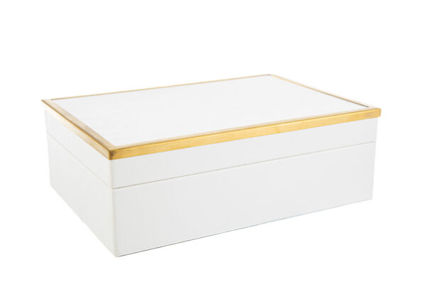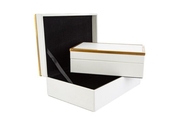 Set di due bauletto in legno bianco, dimensioni 27,5×19,5×10,5 cm. Soluzione elegante e funzionale per organizzare oggetti in modo pratico.