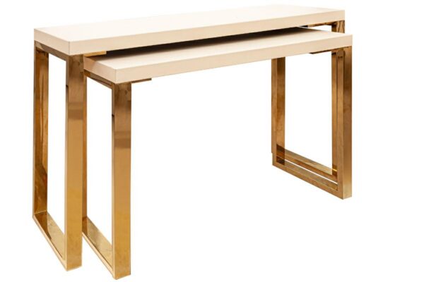 Set di due tavolini in legno color panna, dimensioni 120x37x79 cm. Ideali per arredare con sobrietà e versatilità spazi moderni o tradizionali.