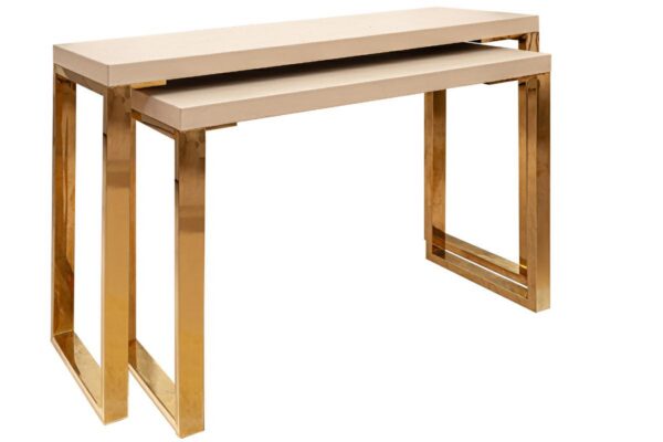Set di due tavolini in legno color tortora, dimensioni 120x37x79 cm. Perfetti per creare un’atmosfera moderna e funzionale in ogni spazio.