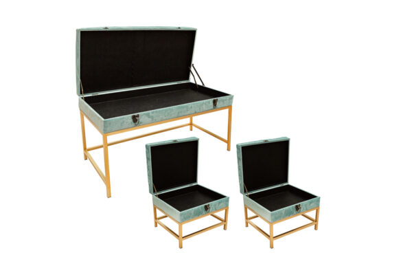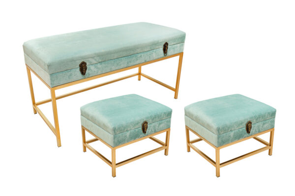 SET 3 PANCHINE METALLO IMBOTTITEC/CONTENITORE VERDE ACQUA 90X40X47 CM