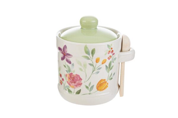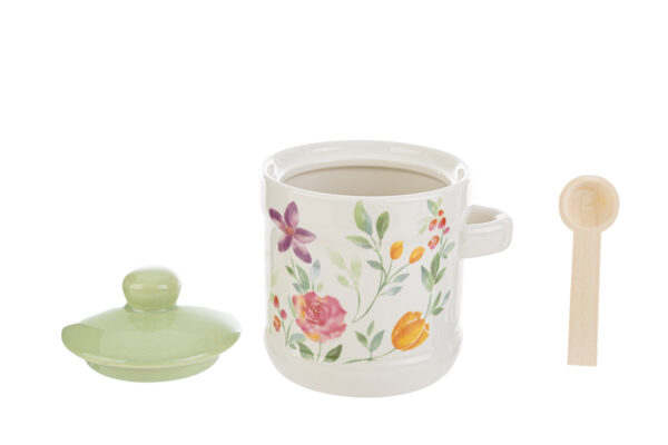 Una zuccheriera in porcellana decorata con fiori, dimensioni 10,5x9xh11,5 cm. Perfetta per aggiungere un tocco di eleganza e freschezza alla tua cucina. Realizzata in porcellana di alta qualità, include un coperchio coordinato e un cucchiaino pratico. Un accessorio indispensabile per servire lo zucchero con stile.