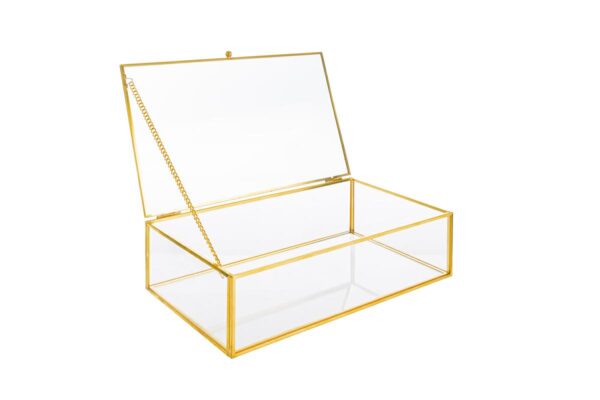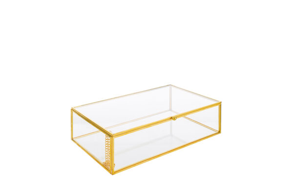 Ideale per esporre gioielli o piccoli oggetti preziosi, la SCATOLA VETRO ORO VINTAGE 25×15,5xh.7CM è realizzata in vetro di alta qualità con dettagli dorati. Design raffinato e funzionale che aggiunge un tocco di eleganza a qualsiasi ambiente. Perfetta sia per uso personale che professionale.