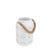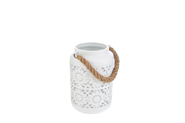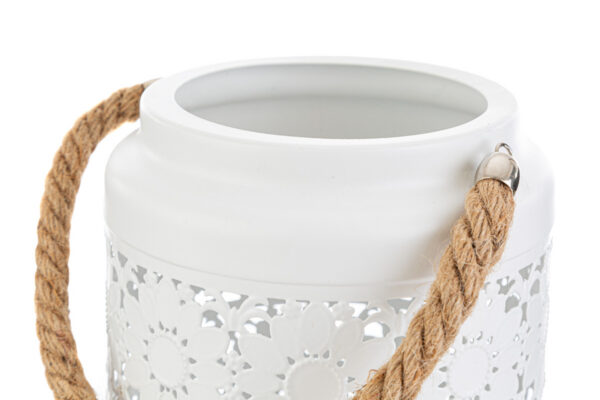 Portacandele in metallo bianco, dimensioni 12x12xh.18CM, ideale per creare atmosfere romantiche e rilassanti. La sua elegante lavorazione traforata proietta giochi di luce suggestivi, mentre il comodo manico in corda lo rende facile da spostare. Perfetto sia per ambienti interni che esterni, aggiungendo un tocco chic alla tua decorazione.